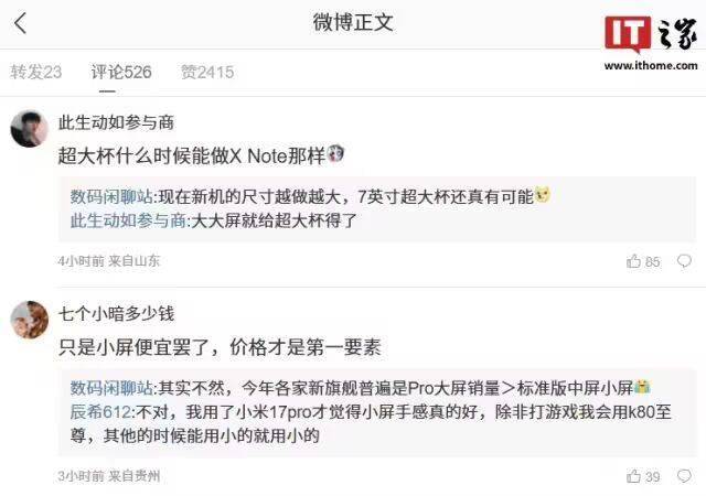 在評論區,博主還回復了網友的一些問題。針對網友關于超大杯手機能否做到像vivo X Note那樣大的疑問,博主表示,如今新機尺寸越來越大,7英寸超大杯手機還真有可能出現。對于“只是小屏便宜,價格才是第一要素”的觀點,博主回應稱,實際情況并非如此,今年各家新旗艦中,Pro大屏版本的銷量超過了標準版中屏和小屏版本。